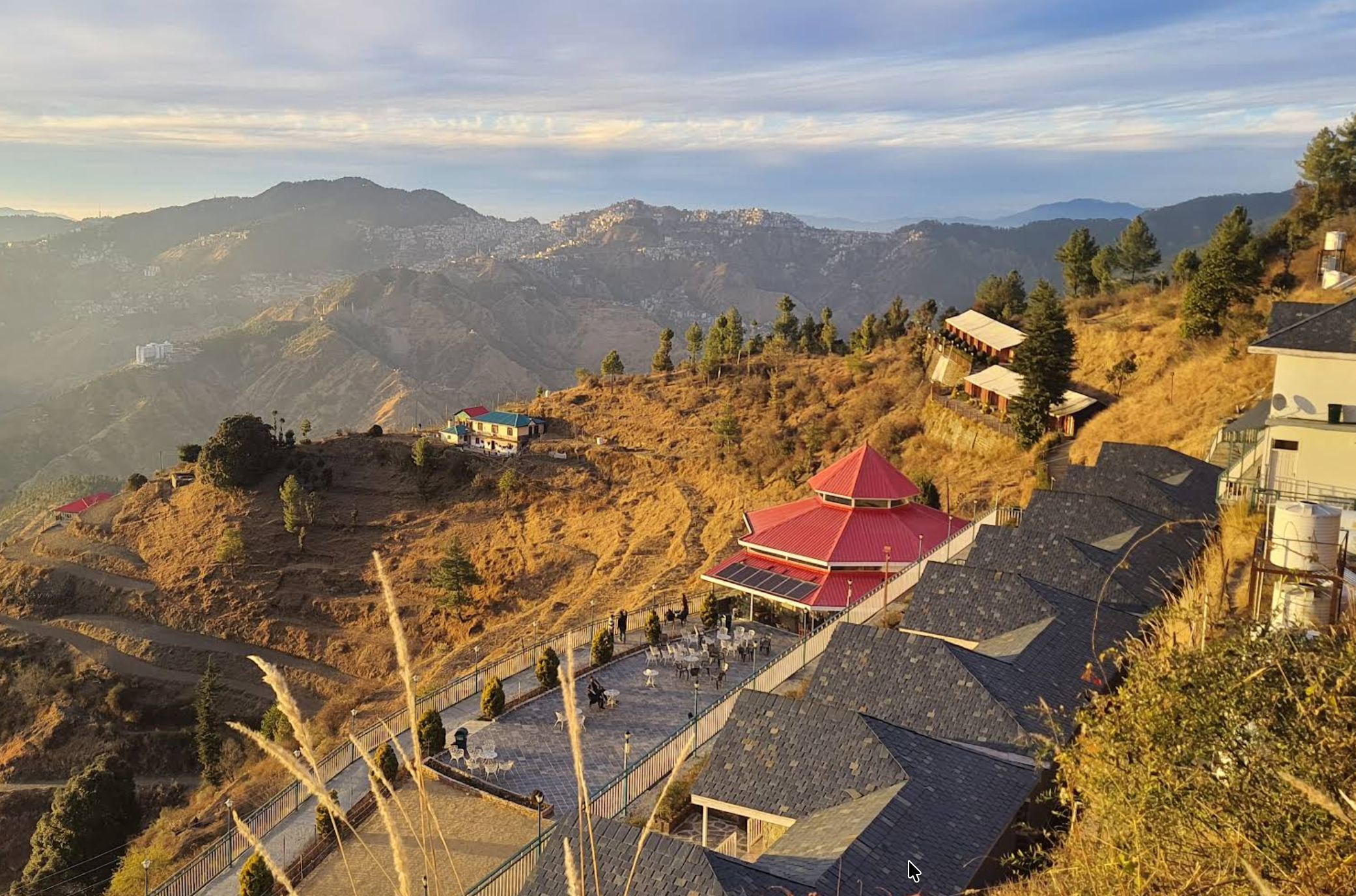 If you want luxury without sacrificing the camping vibe, Koti Village Resort nails it. Eight luxury stone cottages and twelve Swiss tents, all overlooking a gorgeous valley with Shimla city visible in the distance.